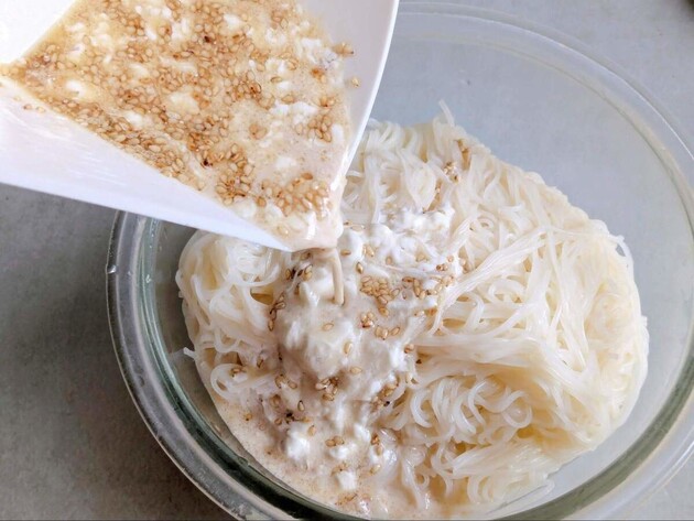茹でて水気を切ったそうめんを加えて、全体にしっかり絡めます。