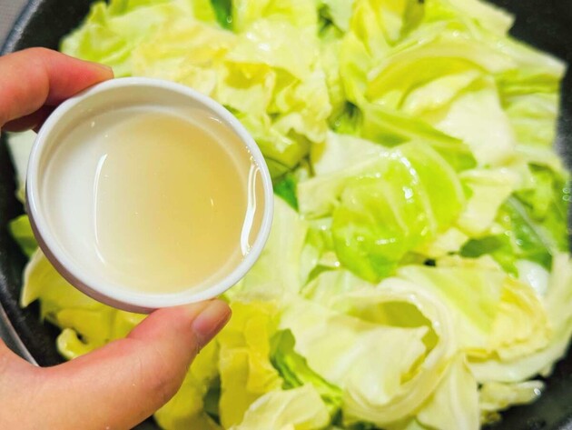 フライパンに米油を熱し、【1】のキャベツを30秒ほどサッと炒めましょう。