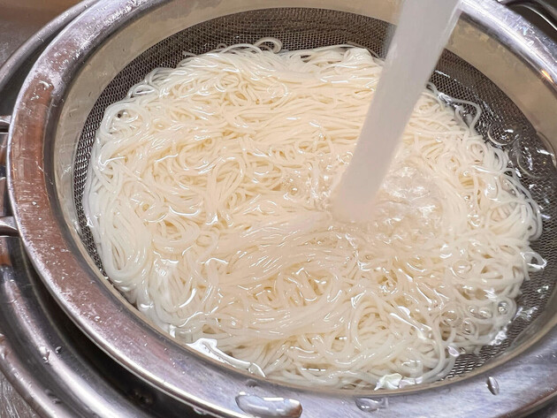 そうめんは袋の表示を参考にゆでて流水でよく洗い、水けをよくきっておきます。
