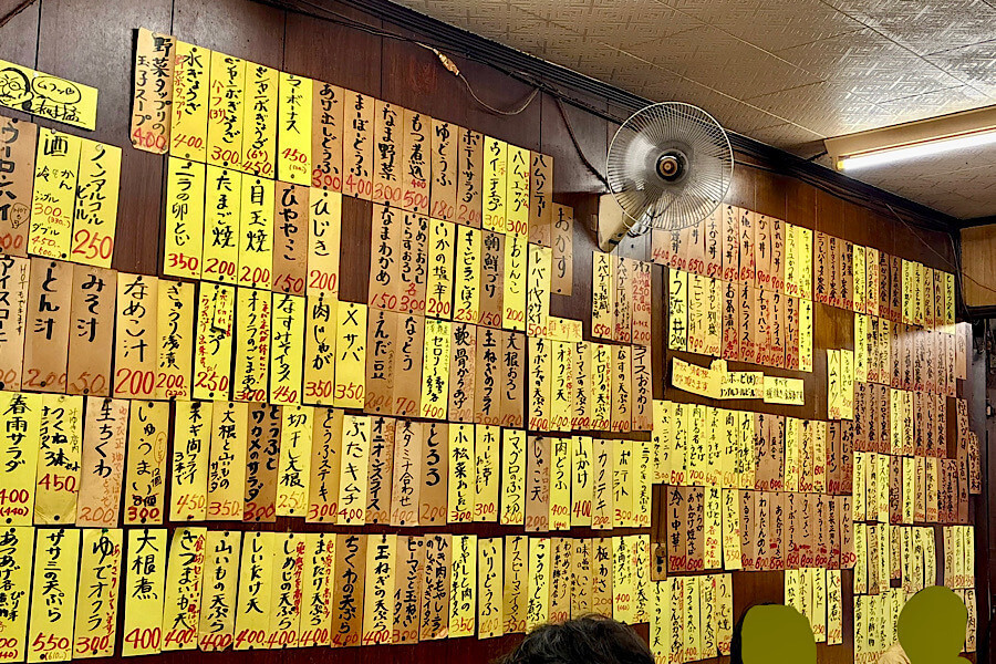 席の後ろの壁一面には、ドラマで見た通り黄色い短冊にメニューがびっしり貼ってあります。お店の人は全部メニューを覚えているんだろうか・・・という余計な心配をしてしまいますが、ともかく圧巻です。