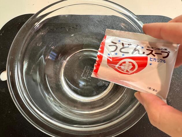 うどんスープを水で溶きましょう。