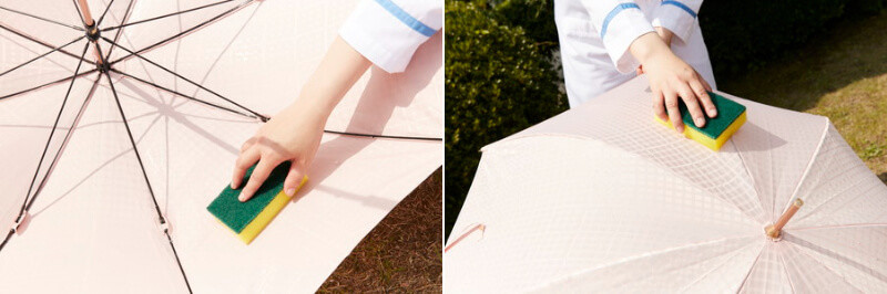 洗剤液をつけたスポンジで傘の内側全体→外側全体の順でこすり洗いします。