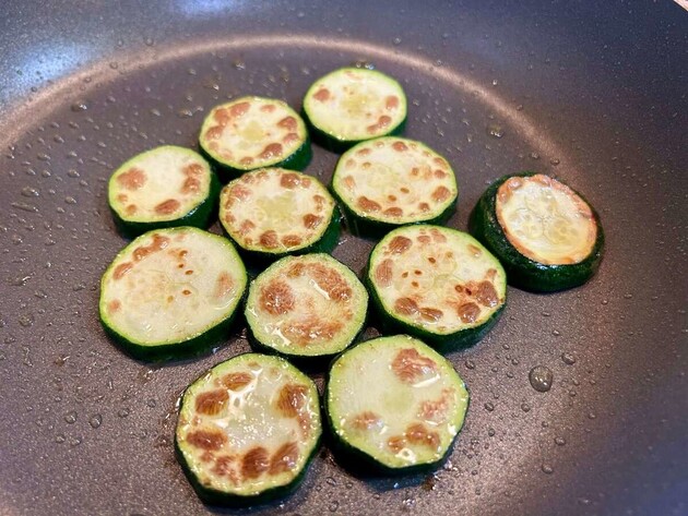 フライパンにオリーブオイルを熱したら、ズッキーニの両面を焼きます。