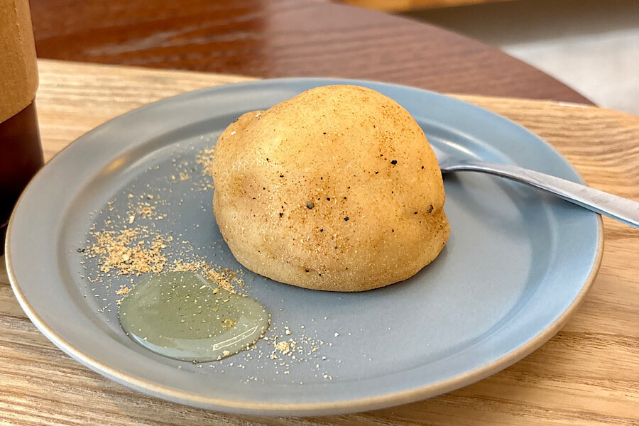 ジャガイモを練り込んで食感がホクホクのパンに、はちみつをかけて食べるおやつです。
