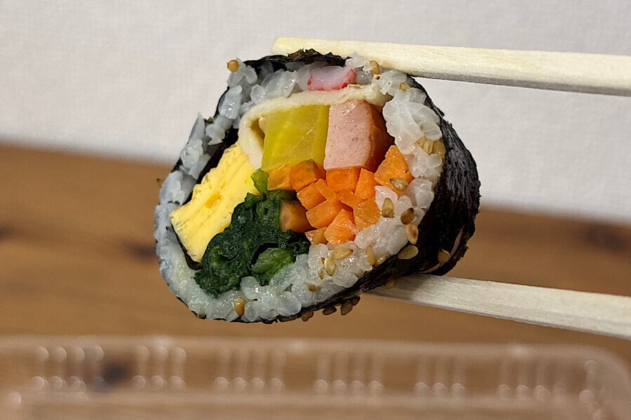 しかし、箸で持ち上げると大体形が崩れてしまって、具材をバラバラに食べることになってしまいました。口の中で海苔とご飯と具を合流させて味わいました。