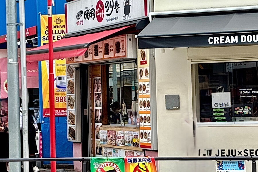 ところ変わって、大久保通りとつつじ通りが交わる大きな交差点に行くと、その角にある「明洞ちびのり巻き」の前には現役の女子学生らしき人々が並んでいるのが見えます。