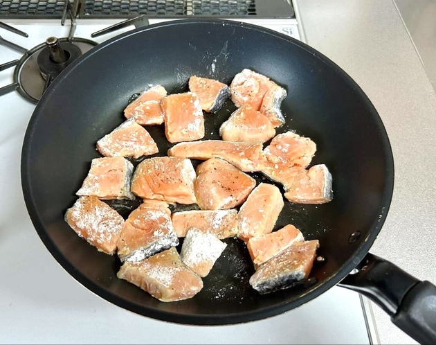 下味をつけた鮭に小麦粉をまぶしたら下準備は完了。