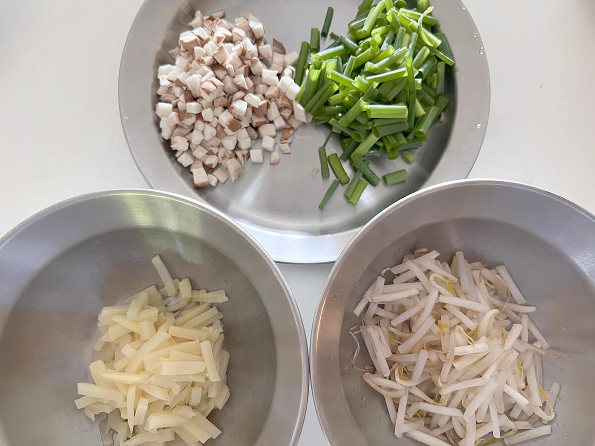 たけのこ、もやし、万能ねぎは2cm長さに切り、しいたけは5mm角に切ります。