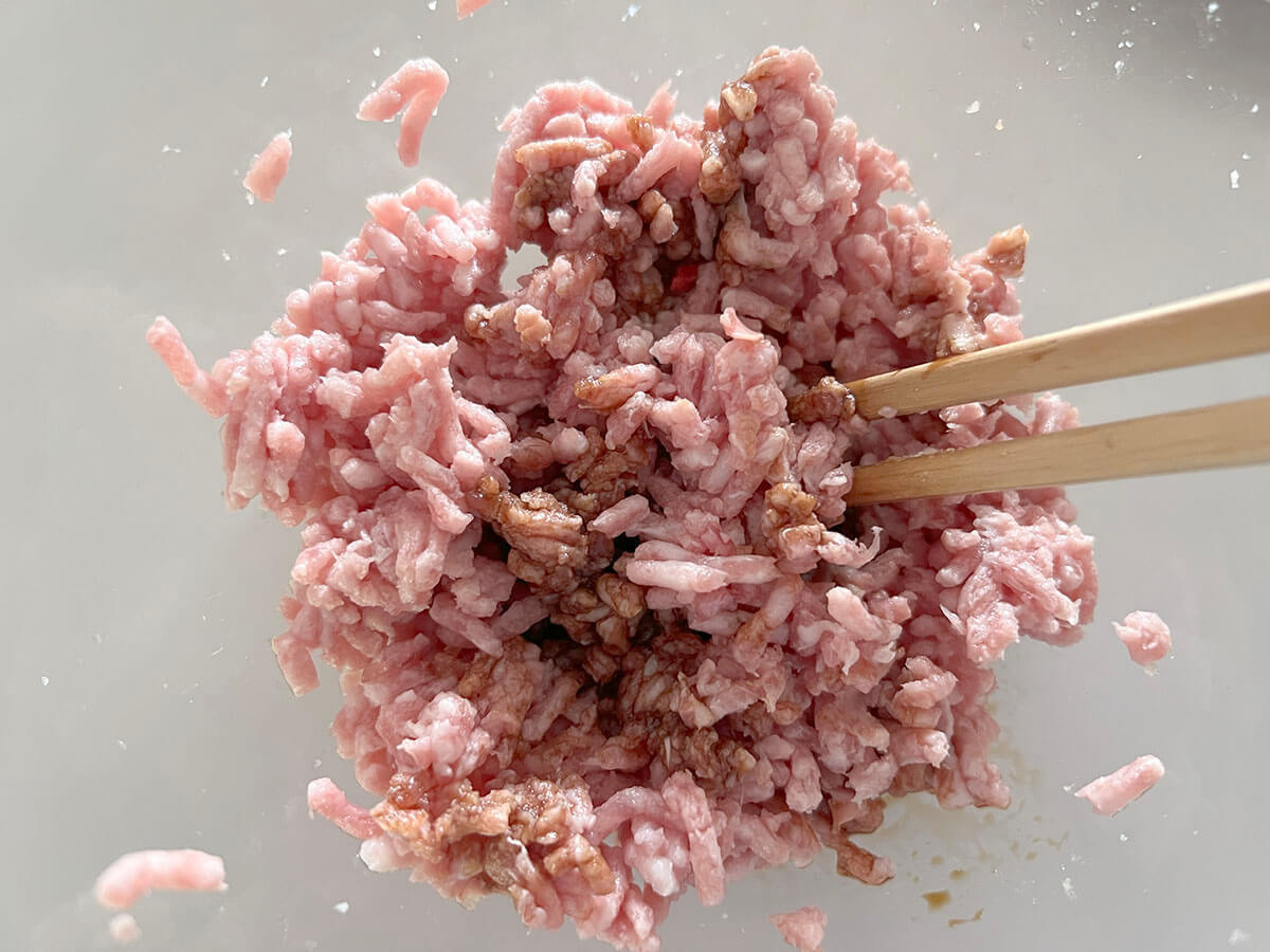 豚挽き肉に味つけの塩、しょうゆ、オイスターソース、砂糖、片栗粉、ごま油を順に加えながら箸で混ぜます。