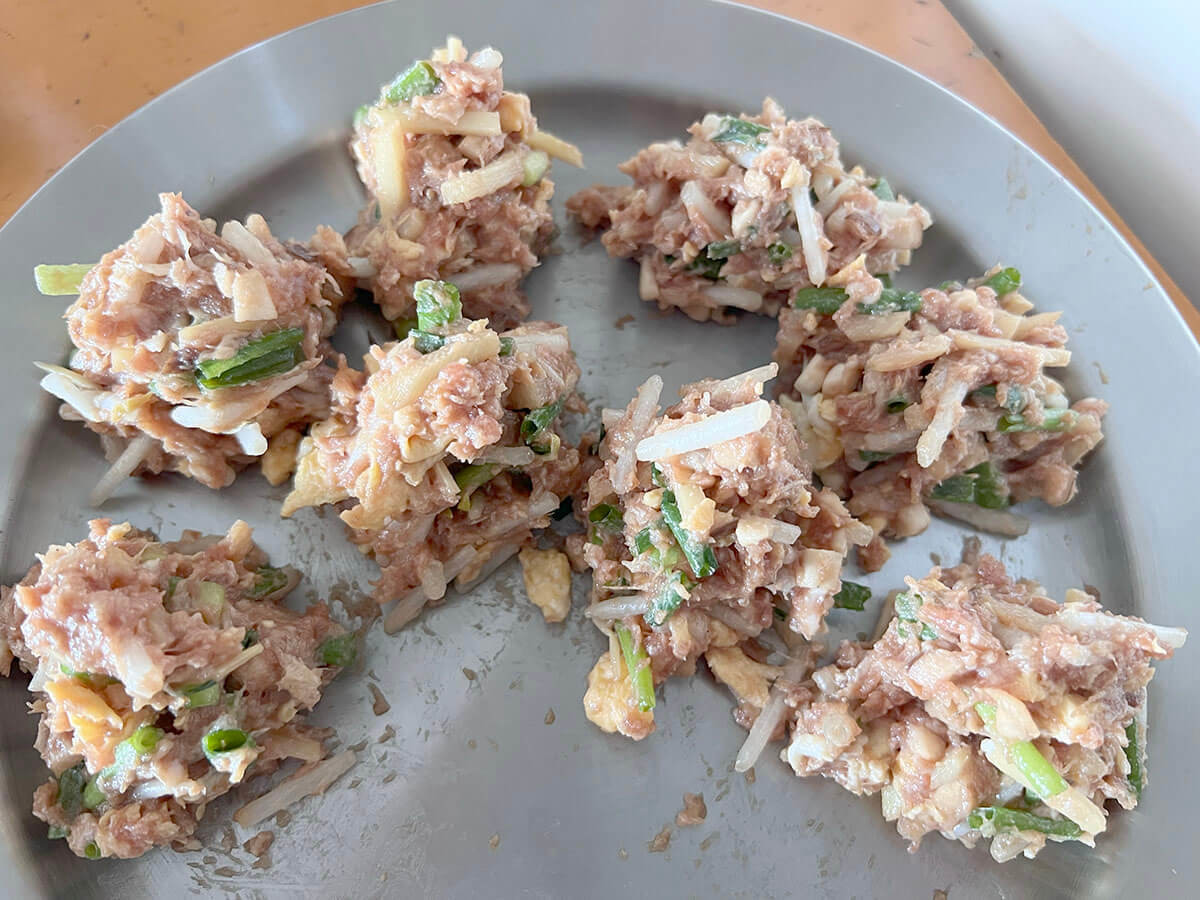 その後、もやし、万能ねぎ、たけのこ、しいたけ、炒り卵を加えて混ぜましょう。全ての材料を小さく切っておくと、とても混ぜやすいのですねー。