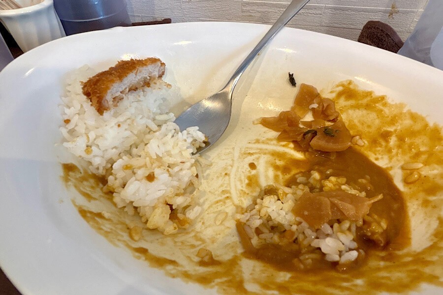 ご飯よりもルーが早く減ってしまったので、危うく福神漬けとご飯だけになりそうでした。メニューを見返すと、「ルーのみ大盛」というのがあったのでこれを頼めばよかったと思いました。