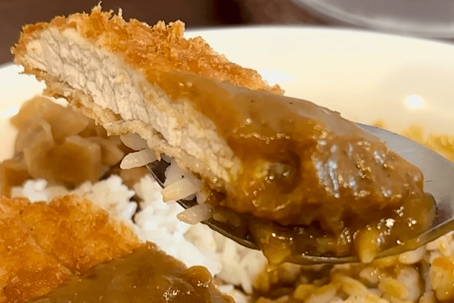 豚肉の厚みはないですが、柔らかい肉質で甘みさえ感じます。カレーに合わせるのにはこのぐらいの厚みがちょうどいいです。