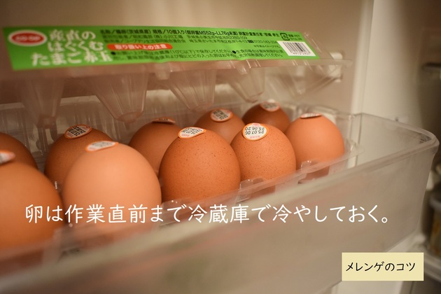 卵は作業するぎりぎりまで冷蔵庫でよく冷やしておきます。「冷やしておく」はメレンゲにとても大事で、冷えているほど白身は泡立ちがよくなります。常温だとゆるい泡のメレンゲになってしまうので、要注意です(黄身は常温で大丈夫)。