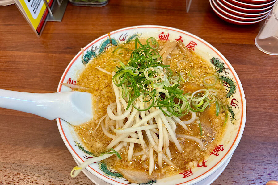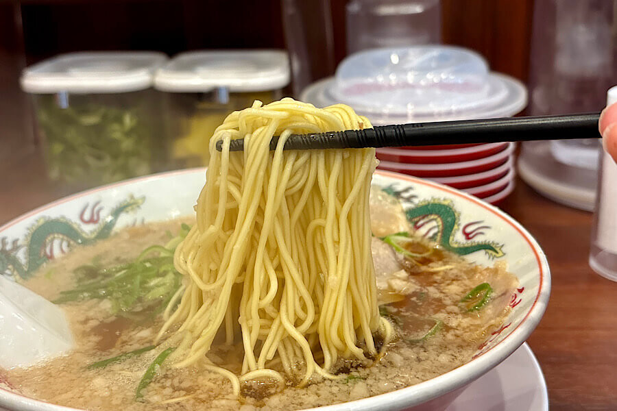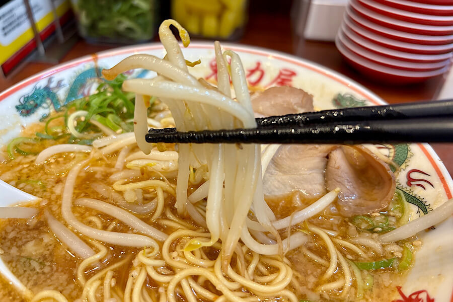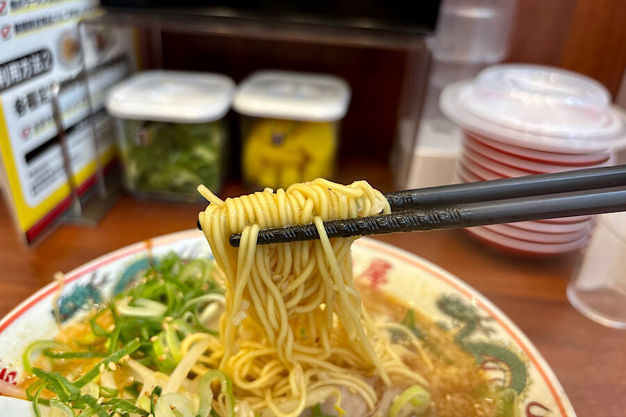麺は細いストレート麺で、博多のとんこつラーメンに使っているような麺です。スープとよく絡んで口の中でいい具合に合流します。