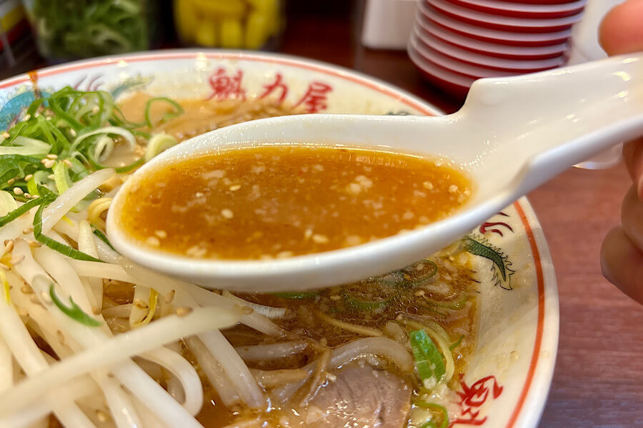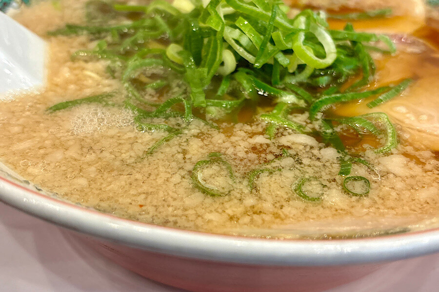 ひと口スープを飲むと醤油のコクのある味がします。背脂がいい感じの旨味になっています。見た目からこってりしているのかと思っていましたが、意外とあっさりしたスープです。