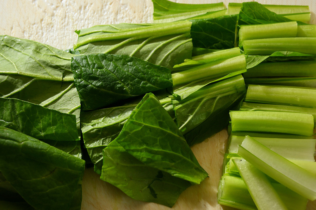 小松菜はよく洗ってから、根元に十文字の切り込みを入れます。