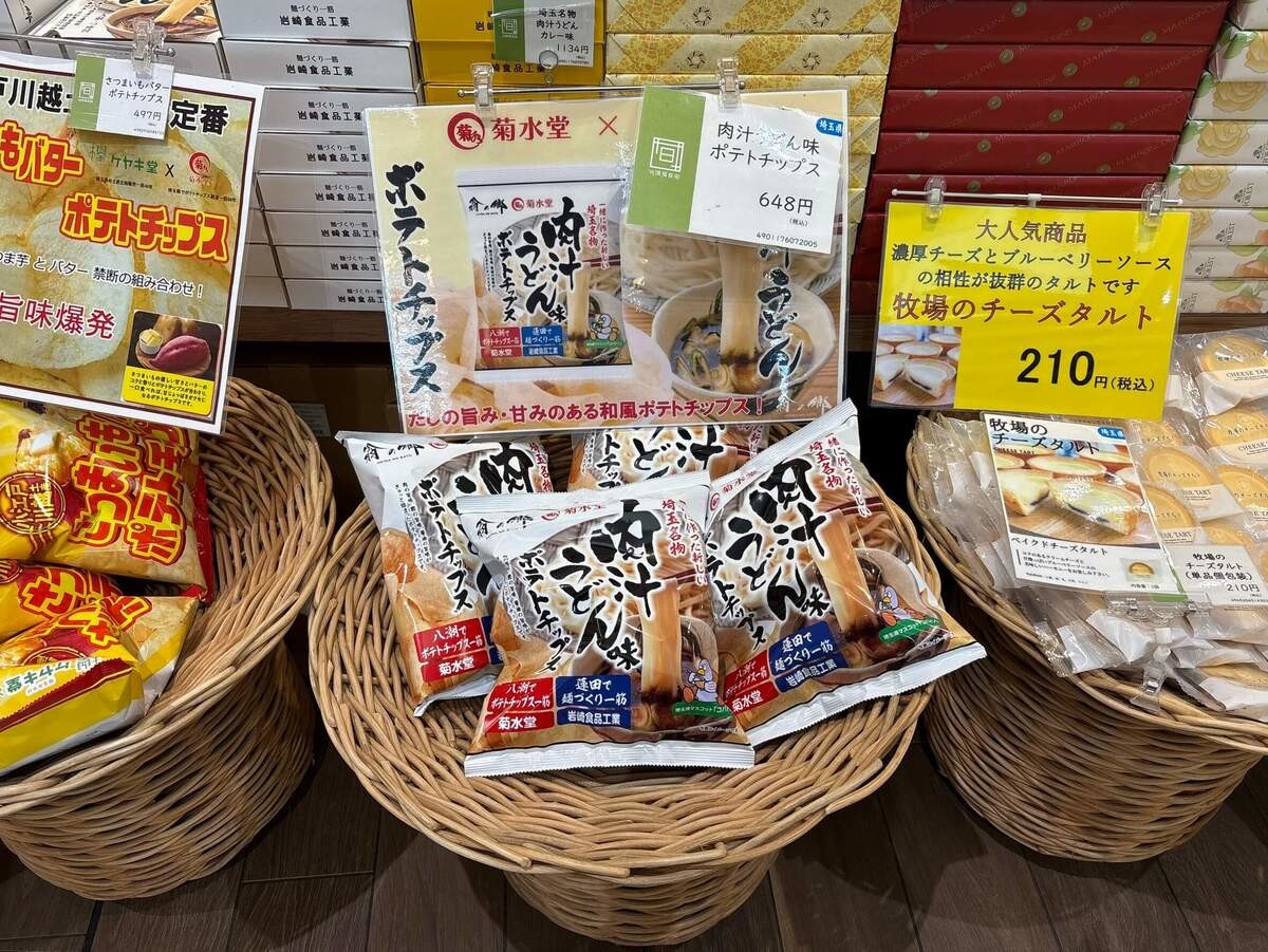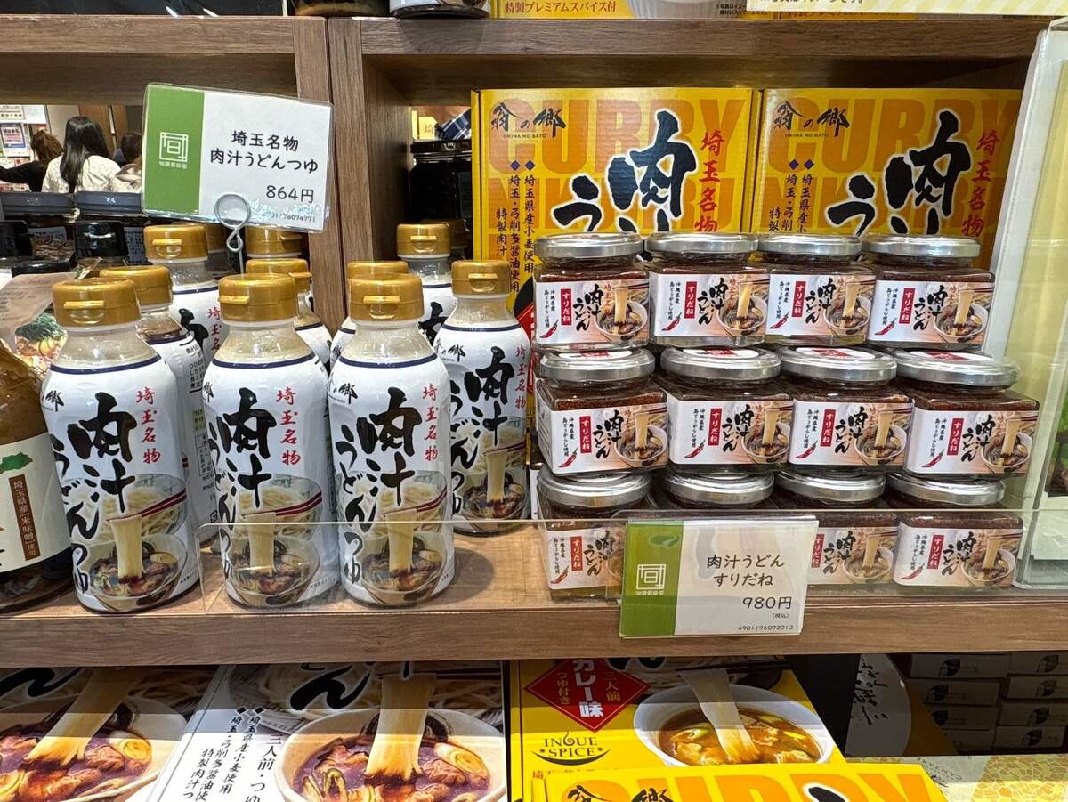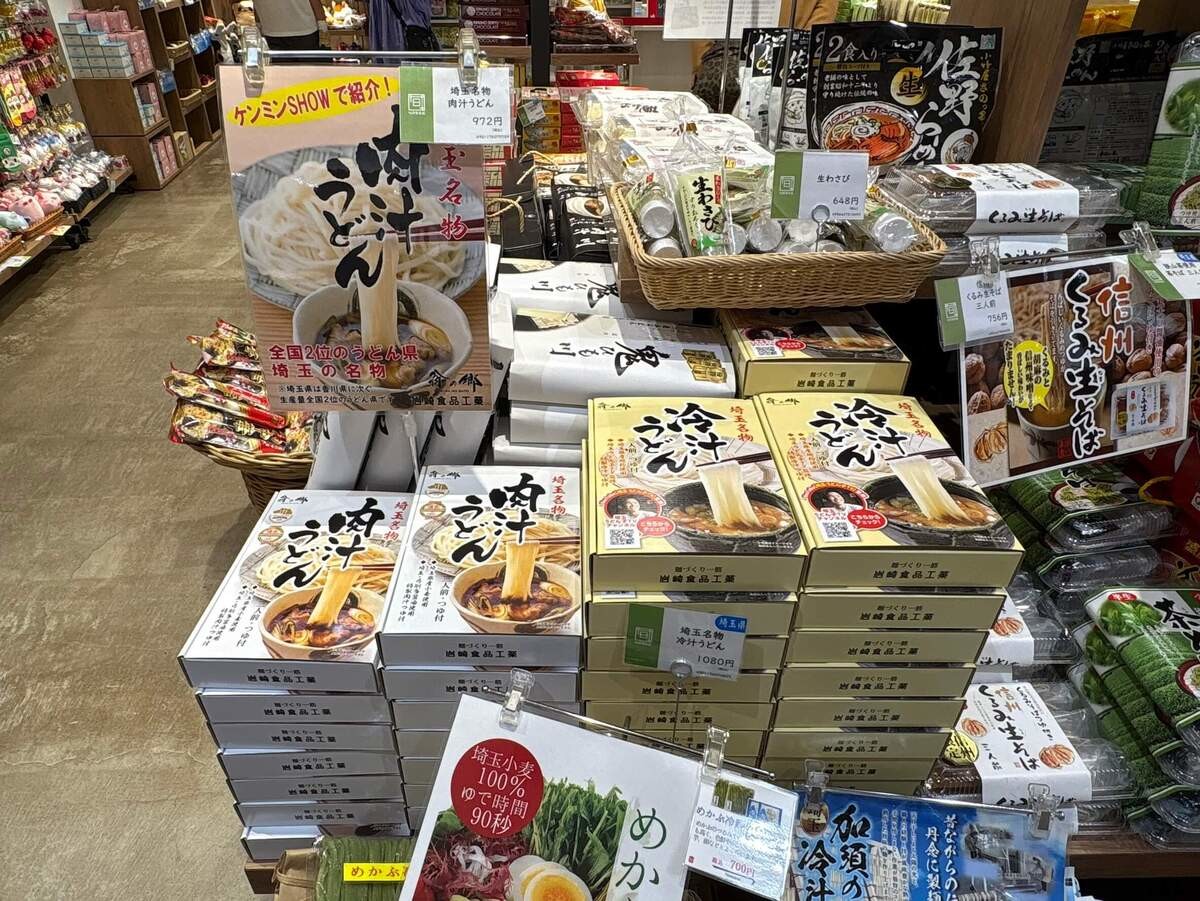 ▲お土産コーナーには「肉汁うどん」のほか、「熊谷うどん」「川幅うどん」も