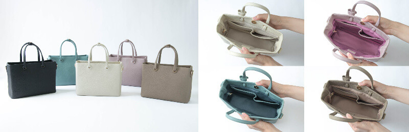 本バッグは、女性をメインターゲットに、普段使いしやすい5色展開(ホワイト/ブラック/ベージュ/ピンク/ブルー)で展開されています。