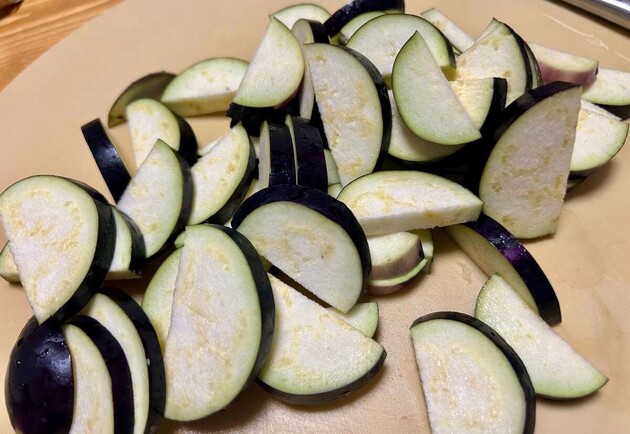 なすはヘタを取ってから、縦半分に切り、2〜3mmの厚さにカットします。