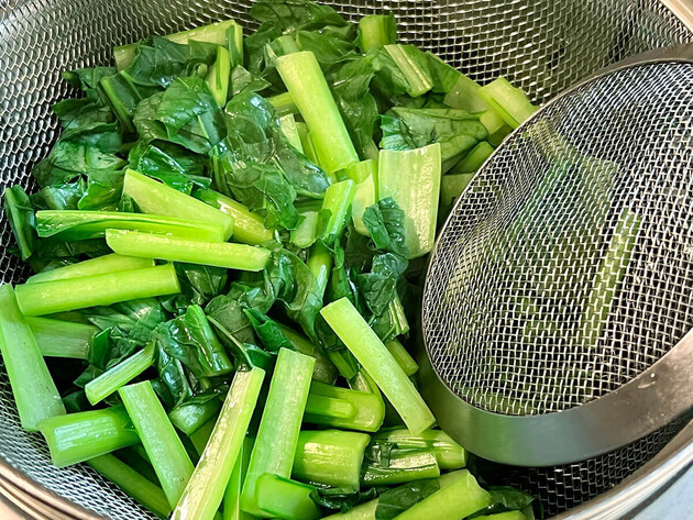 これは日本料理では「醤油洗い」と言われる工程。ゆでた青菜の水っぽさがなくなり、味がぎゅっと凝縮されるのだそうですよ。
