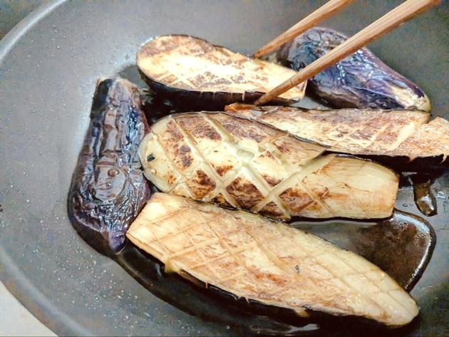 工程をざっくりお伝えすると、なすを贅沢に使って、にんにくと焼いて味付けするだけ。