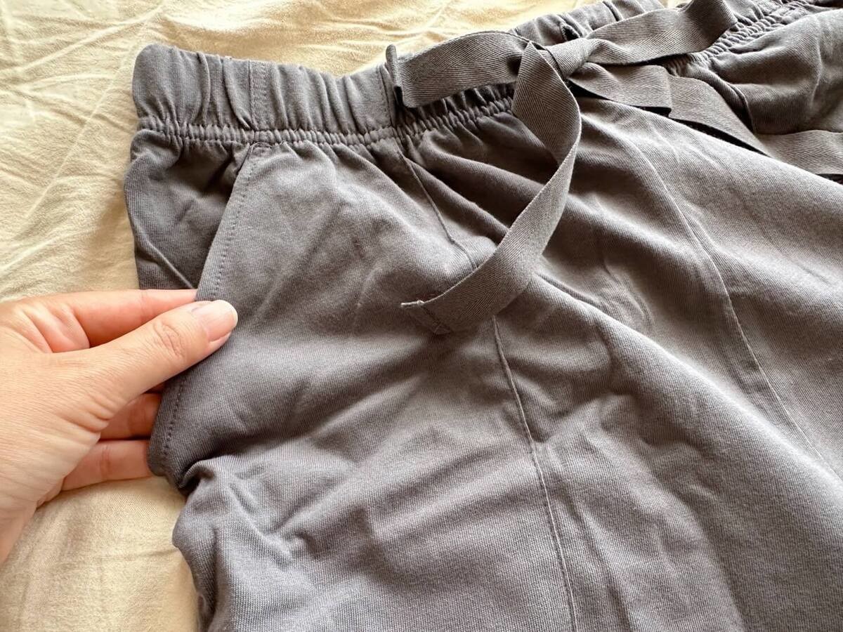 逆にボトムスはパジャマにするには若干ウエストがきつめ。思い切ってウエスト調整用リボンを抜いたところちょうど良い感じになりました。