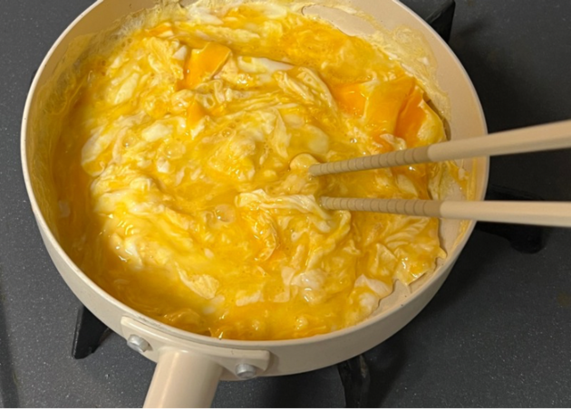 フライパンにごま油を半量(大さじ1/2)入れて中火にしたら、溶いた卵を流し入れてふんわりと菜箸でやさしく炒めます。