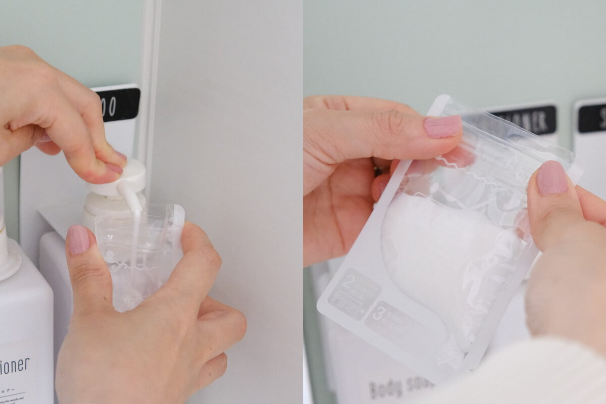 袋の口を開けて、約10mLの線を超えないように中身を入れて、しっかり口を閉じればOK。