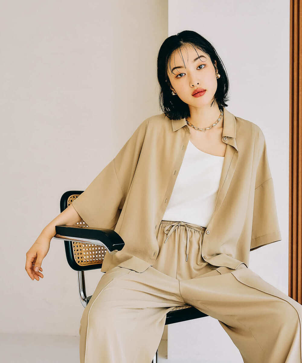 同素材のパンツと合わせたセットアップスタイルも可能!