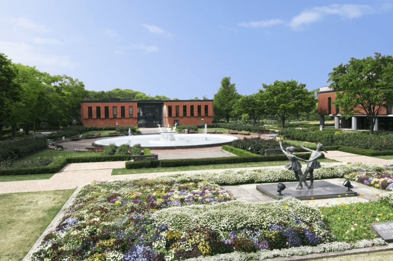 施設内にある日本庭園はバラ、ツバキ、紅葉と四季折々に彩られており、素晴らしい景観を楽しめます。さらに、文化ホールや美術館、石橋正二郎記念館、坂本繁二郎旧アトリエなどが点在し、散策や憩いの場として愛されている施設です。