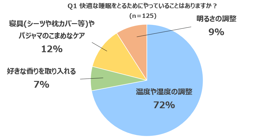 ライオン株式会社で『快適な睡眠をとるためにのためにやっていること』を調査したところ、「温度や湿度の調整」という回答が多かった中で、「寝具やパジャマをこまめにケアする」や「自分の好きな香りを取り入れる」といった回答もみられました。