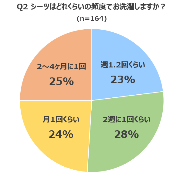 シーツのお洗濯の頻度の調査によれば「月1回くらい」や「2~4ヶ月に1回」という方を合わせると約半数いらっしゃいました。