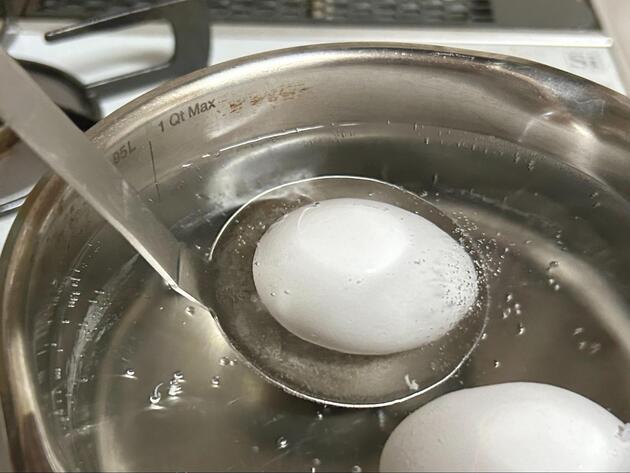 加熱時間は中火〜強火で6〜7分です。筆者は中火で7分でやってみたところ、かなりゆるい状態で殻を剥くのに苦戦し、やり直すことに。