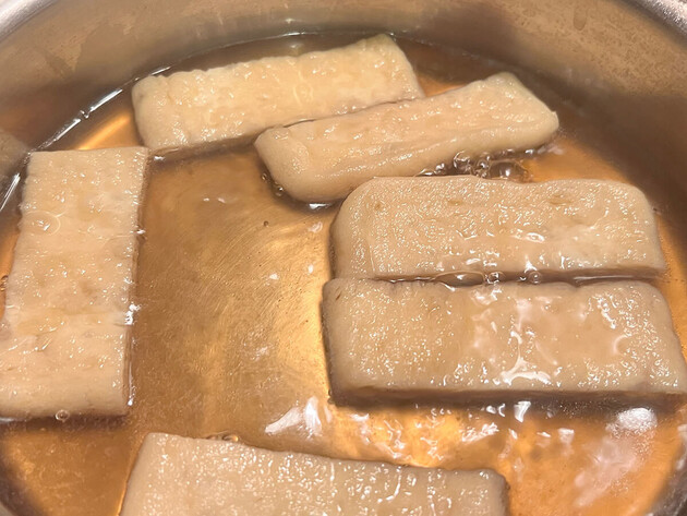 フライパンに煮汁の材料を入れ、中火で熱し、油揚げを加えて煮立ったら少し火を弱め、1分ほど煮ます。