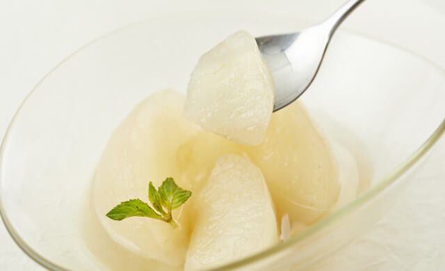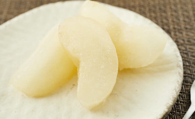 梨をくし形切りにして冷凍する方法。シャーベットやコンポートのような食感を楽しめます。