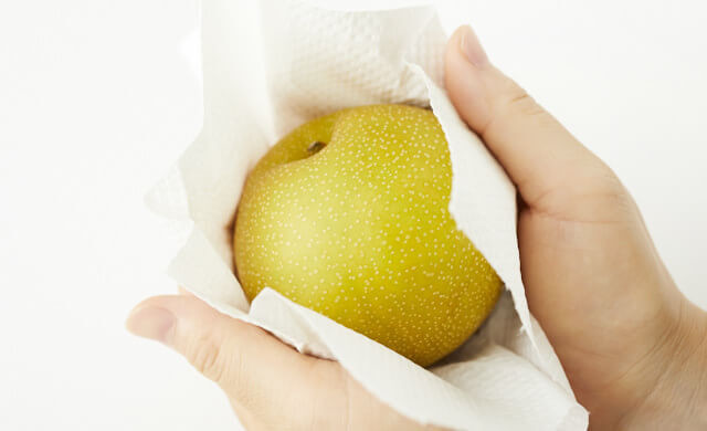 キッチンペーパーが1枚で足りない場合は、2枚重ねて使うとよいです。梨は洗わなくてOK。