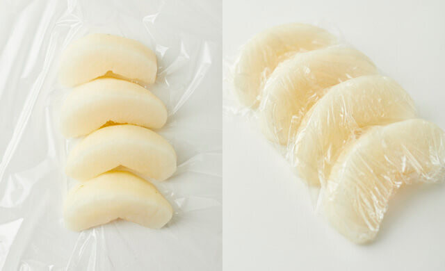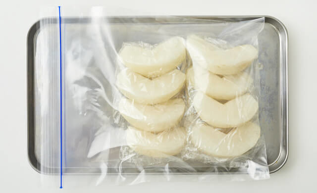 洗った梨を8等分のくし形切りにし、皮をむき、芯を取り除きます。ラップに並べ、ぴったりと包みましょう。