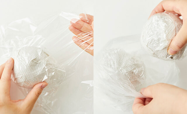 キッチンペーパーの上からラップで包み、ポリ袋に入れて口を閉じます。ポリ袋には複数個まとめて入れてもOKです。
