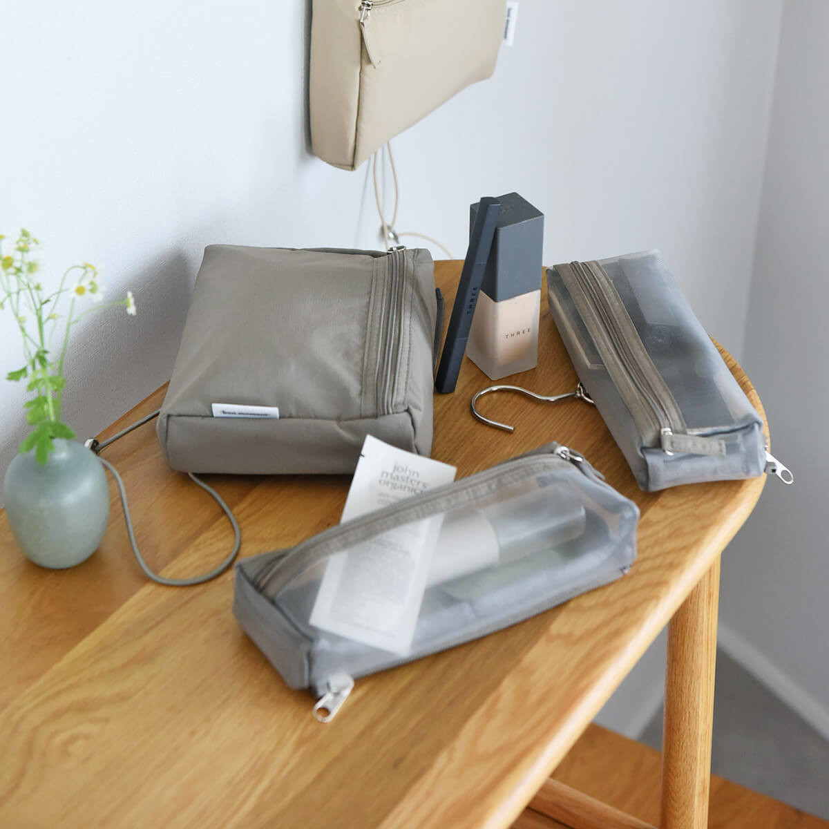 メッシュは通気性がいいので、歯ブラシやスキンケア用品に。ファブリックポーチは中身が見えないので、サニタリー用品入れにもお使いいただけます。