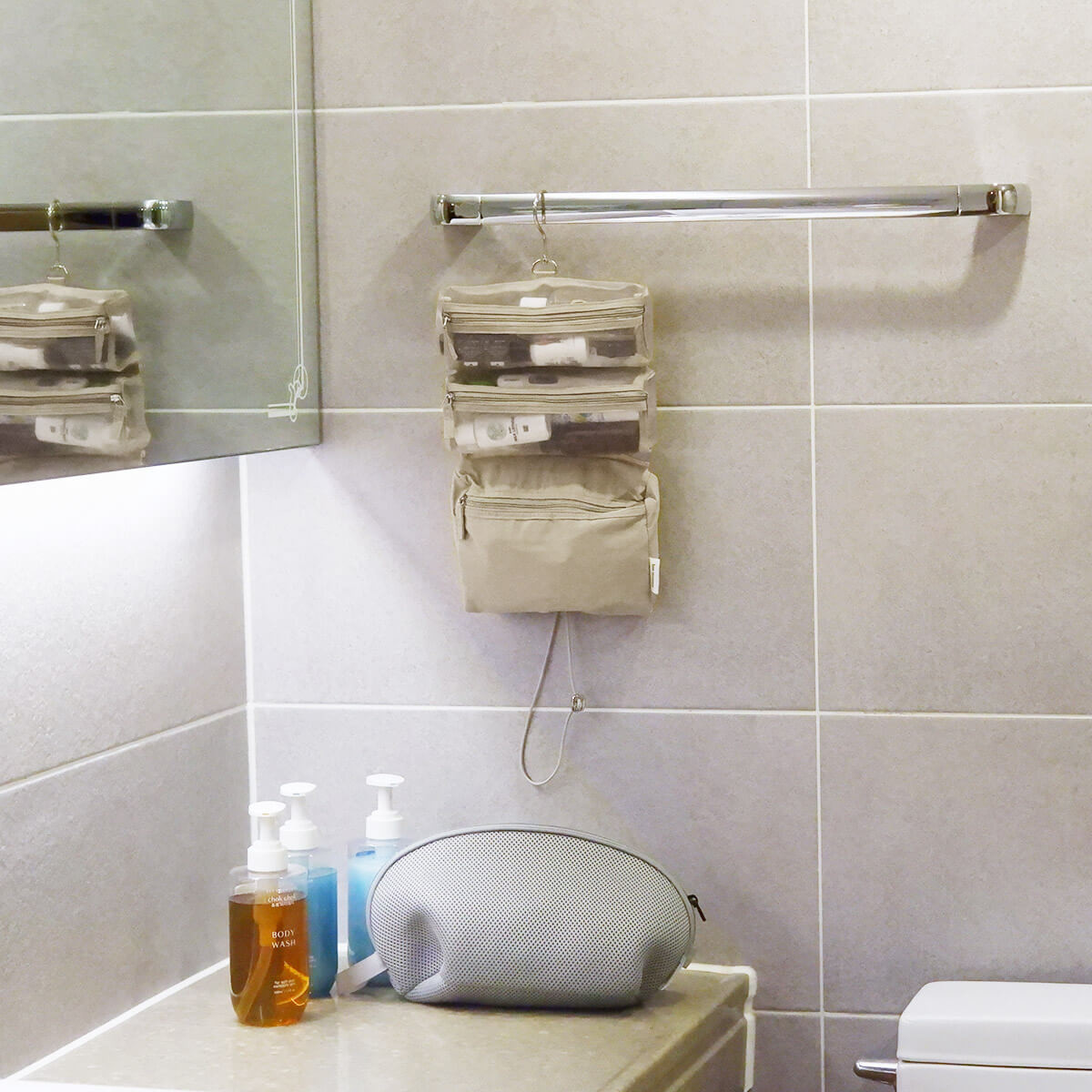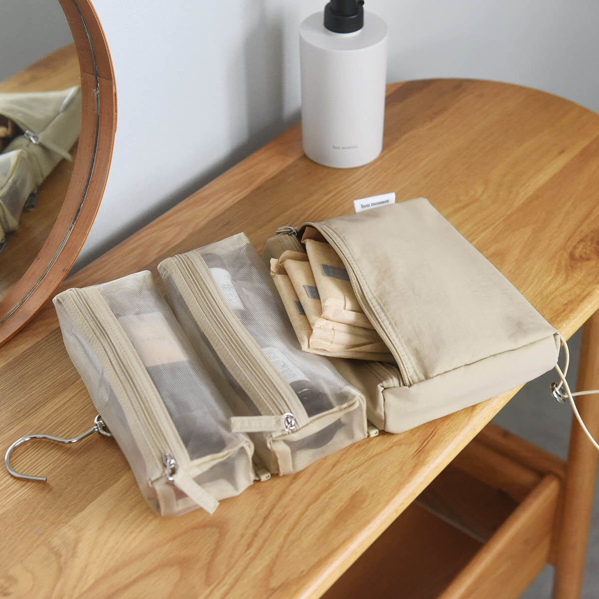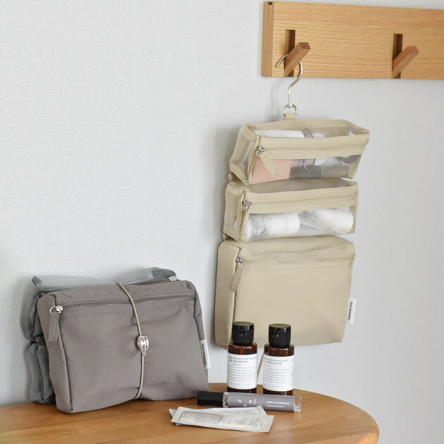 洗面台に吊るせて使えるのはもちろん、ポーチの一部を面ファスナーで取り外せるという大人気の定番トラベルアイテムです。