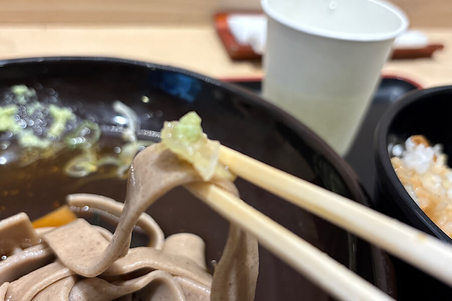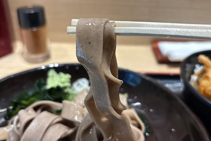 色が違ったらうどんかと思うほど幅の広いそば、2〜3本しか箸で掴めません。そのまま口にもっていくと量が多くて途中で噛み切ることになりました。