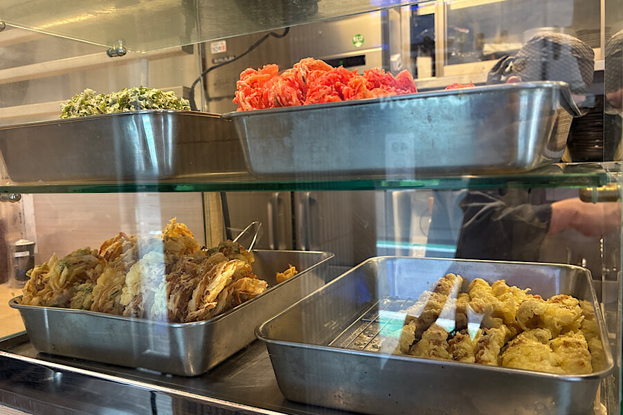 お金を支払い、購入した食券をキッチンカウンターに出すと、まずかき揚げ丼がお盆に置かれました。揚げ物は出来合いなので盛り付けるだけです。