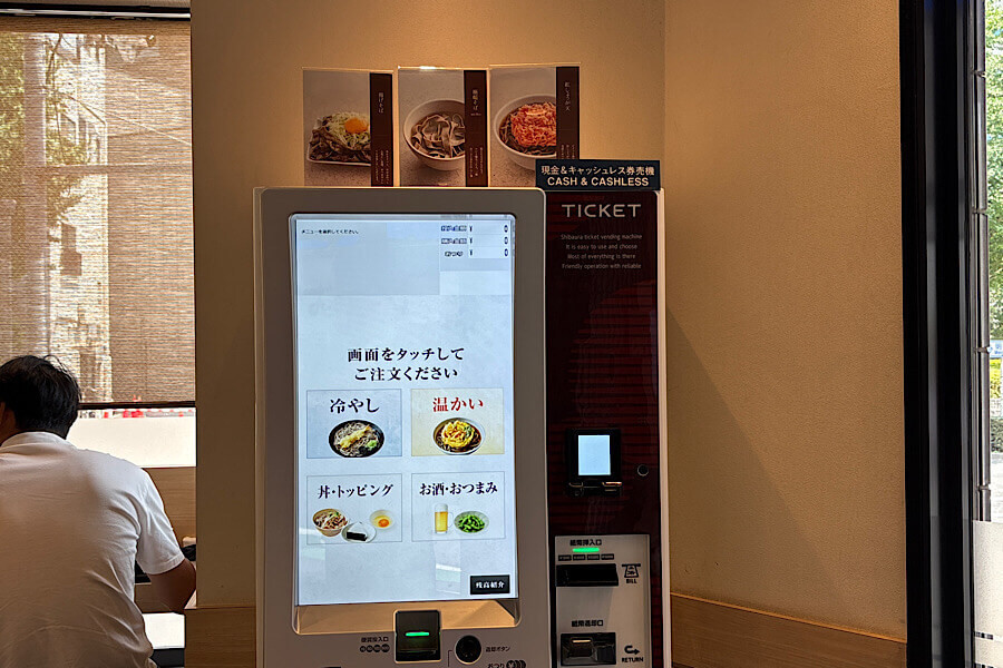 ガラス張りの明るい店内に入り、券売機で食べたいメニューを選択します。暑かったので冷やしそばとかき揚げのミニ丼とのセット(730円)にしてみました。