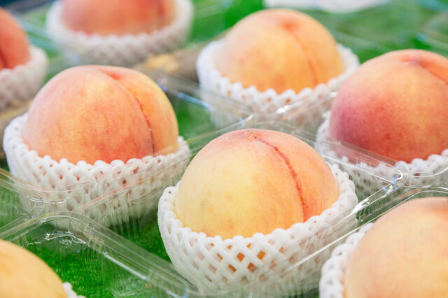 桃を選ぶ際は、指先で押すのではなく、色や全体的な形を見て選んでください。
