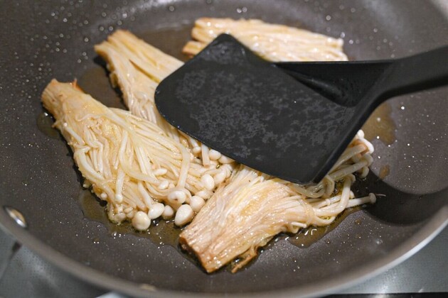えのきの片栗粉をまぶした面を下にしてフライパンに入れ、フライ返しで押さえつけながら加熱します。