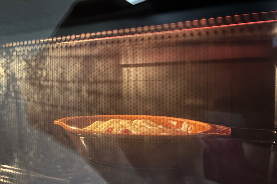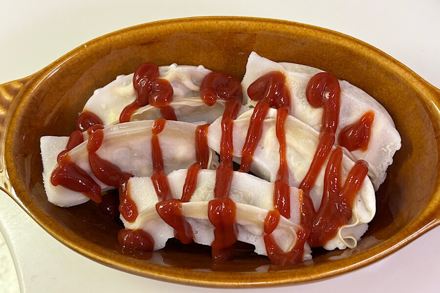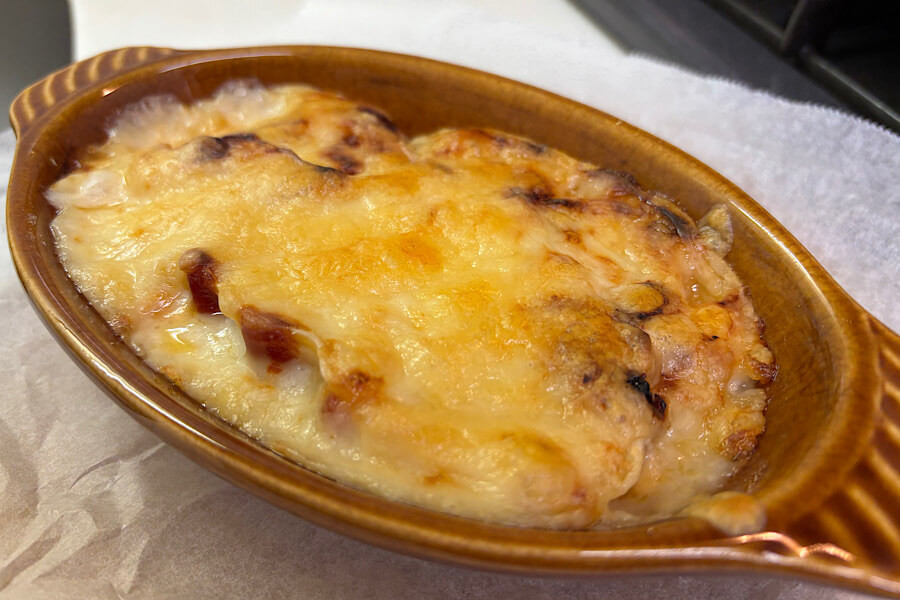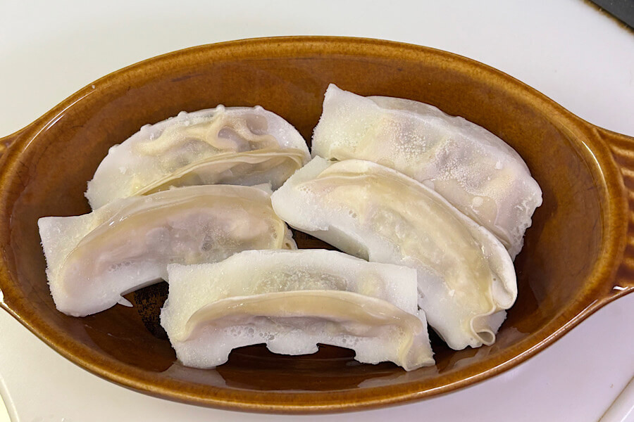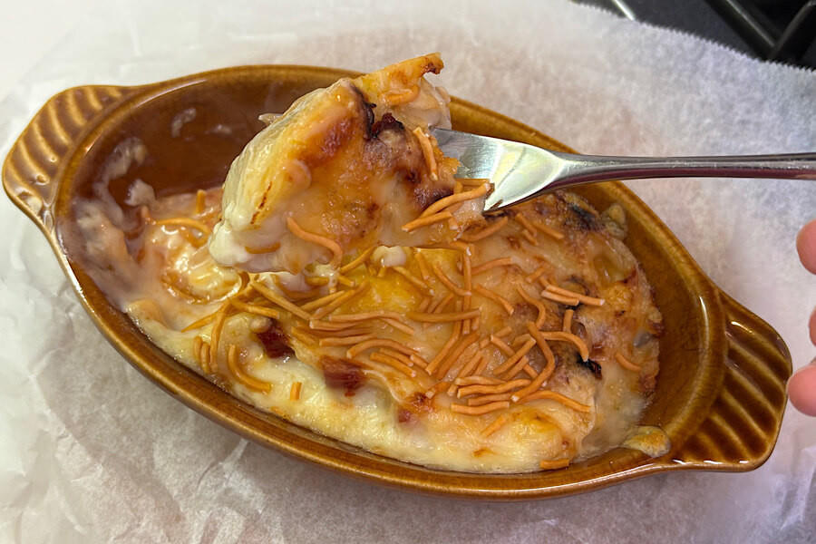 餃子の皮がラザニアのパスタ部分で、中の餡がミートソースのような食感です。羽根の部分の小麦粉が溶けだして、ホワイトソースと合わさっていい”とろみ”になっています。