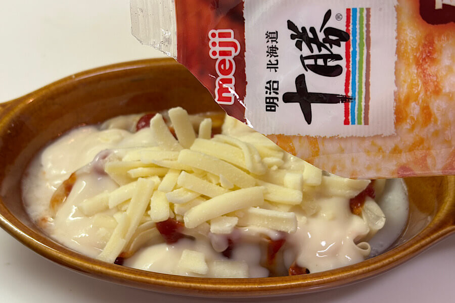 作り方④ 溶けるチーズをかけて、オーブントースターで7分焼きます。