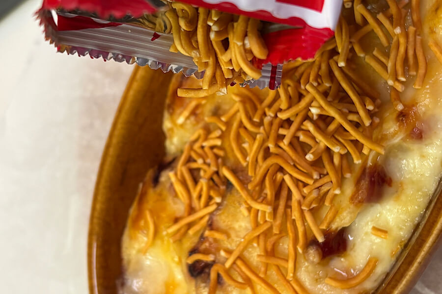 作り方⑤ 焼きあがったら、ベビースターを散らして完成です。