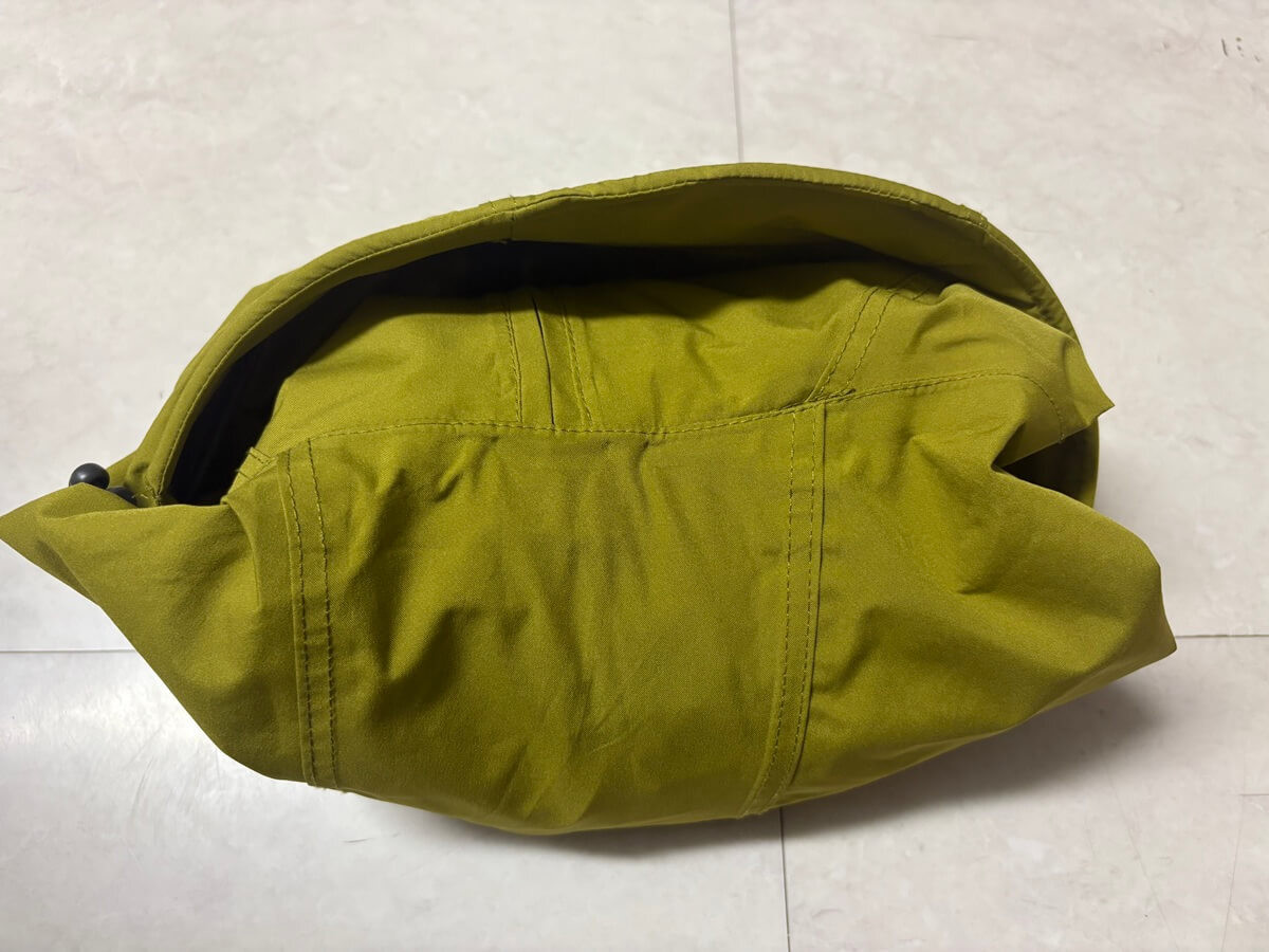 さらにこちら、付属で持ち運び用の袋がついているのですが、ズボラな私はウエア部分を小さく畳んで、それらをフードに押し込み、コンパクトにして持ち歩いています。