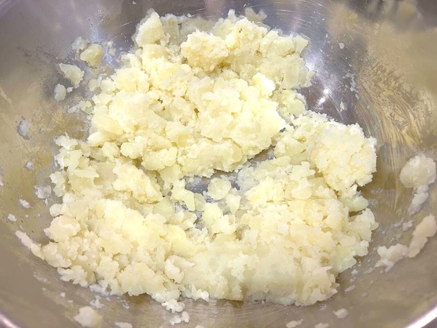 ②でゆでたじゃがいもをボウルに入れ、熱いうちにつぶします。